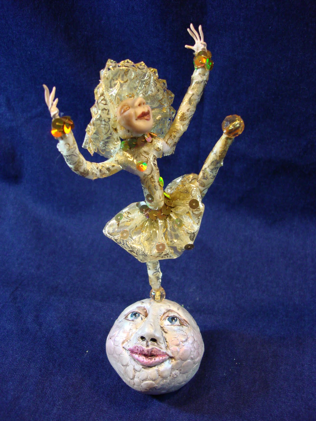 I love to sculpt faces and I generally have several "heads on sticks" (sculpted heads on dowels) sticking in the tool holder or in the paintbrush basin on my studio table. Sometimes it takes me a while to get around to completing the dolls.Professor Pocus changed so many times from the original concept (and his head had been around my studio for a couple of years). Originally I intended to do a European style hobo clown holding a skeletal umbrella. The idea was to put him in the guest room when I had it painted. I sculpted his head, hands and feet and there he sat in that state for over a year.